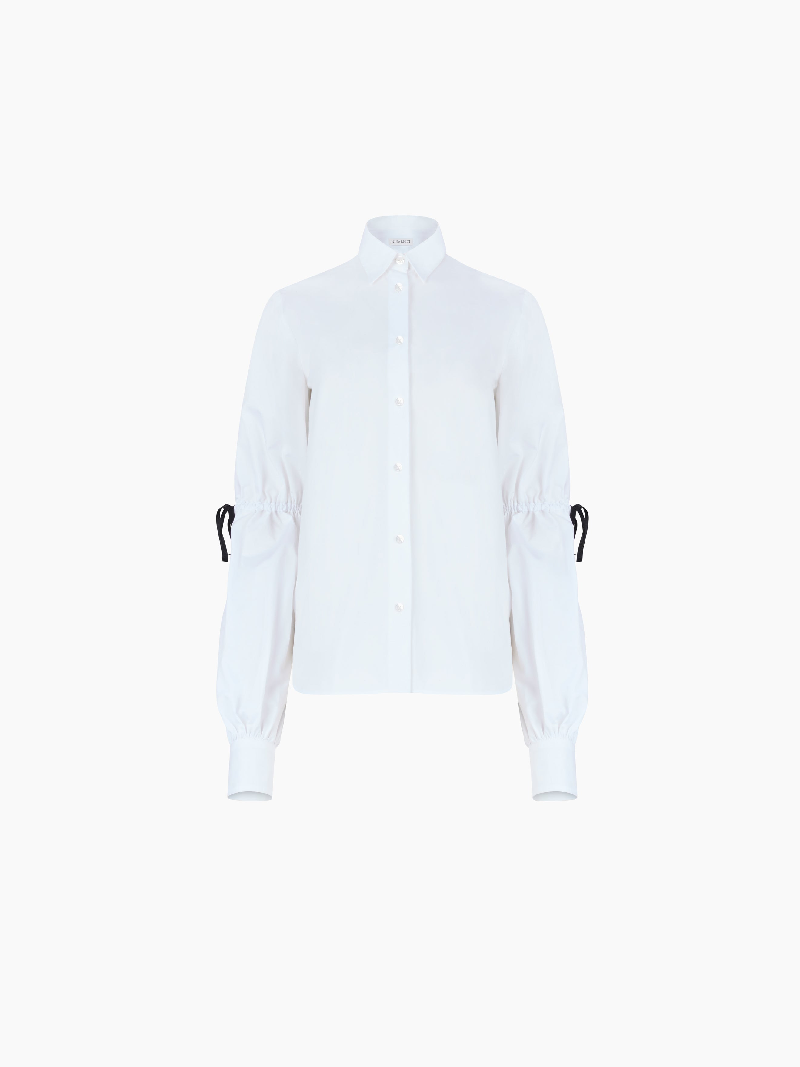 This white cotton poplin shirt stands out with gathered sleeves and exaggerated volume. Black satin bows accent the elbows, revisiting a signature Nina Ricci code with graphic contrast. From the Spring-Summer 2026 collection, it blends tailoring precision with a romantic gesture—true to Harris Reed’s expressive interpretation of the house. COMPOSITION & DETAILS - 100% cotton. - Bow details on the sides. - Model is 179 cm/ 5ft 10in and wears size 36 (FR). - Ref: 26PCTO005CO0539U1000