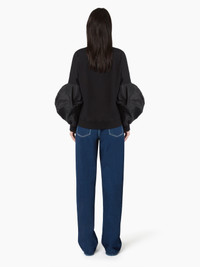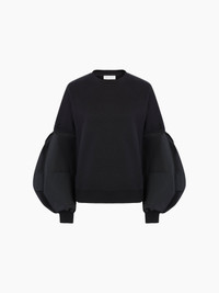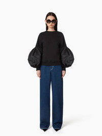 A classic in the Nina Ricci collections, the hoodie is reinterpreted for the Spring-Summer 2025 collection in a soft, comfortable fleece. Its cocoon sleeves, a signature of the Maison Nina Ricci, give it a modern touch and offer a resolutely feminine look. COMPOSITION & DETAILS - 100% cotton. - Fitted cut. - Round collar. - Elasticated ribbing on sleeves and bottom. - Contrast faille ruffle bottom. - Model is 182 cm and wears a size S. - Ref : 25PJTO020CO1089U9000