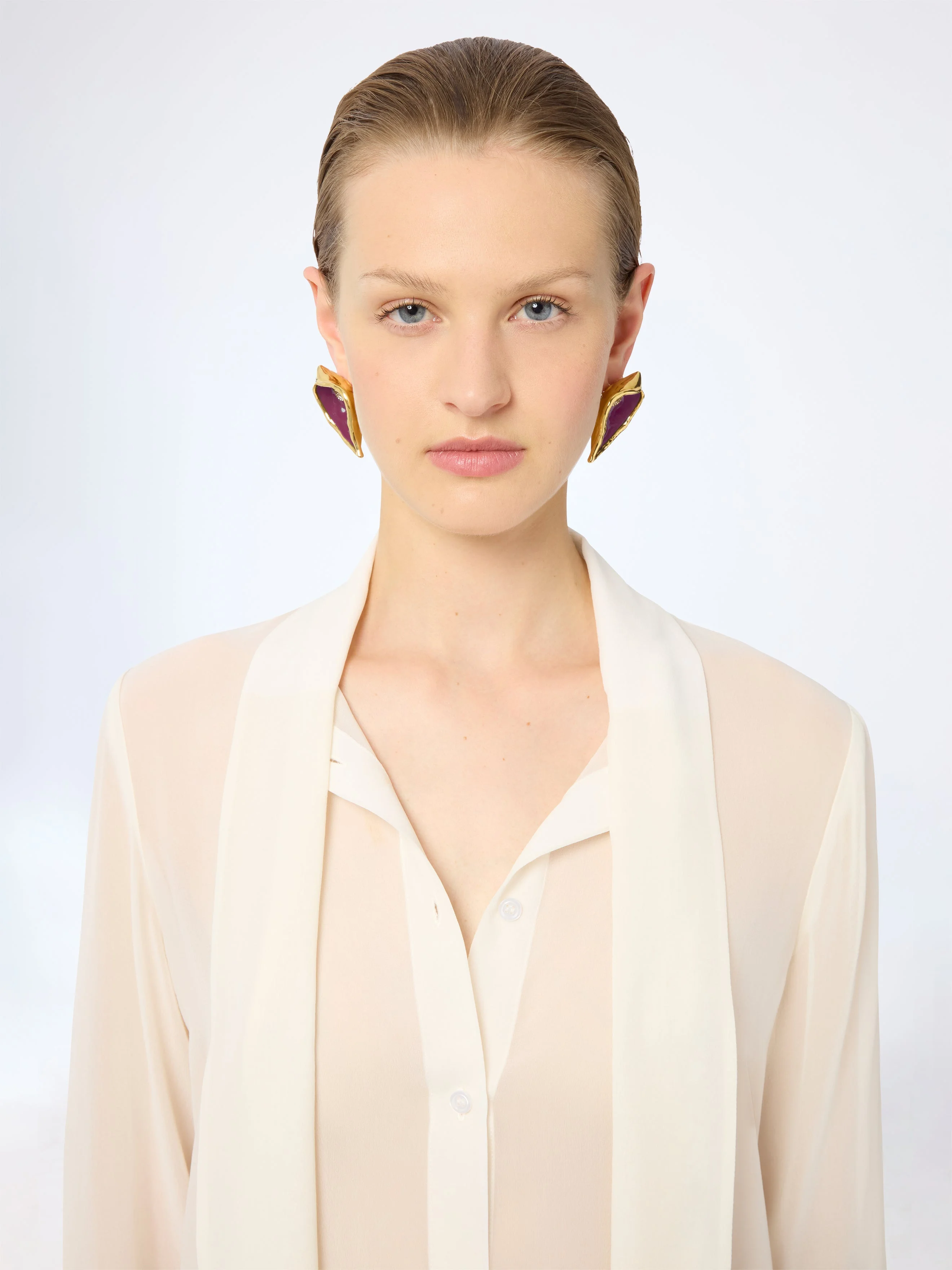 The “Calla Flower” clip earrings feature a curved petal form in deep purple enamel, outlined in gold-tone metal. At the centre, a textured pistil detail brings dimension and light. Bold yet organic, they frame the face with sculptural clarity. A floral silhouette crafted in contrast and curve. These earrings have a clip fastening. COMPOSITION & DETAILS - 91% aluminum 3% enamel 3% brass 2% glass 1% silicon. - Clip fastening. - Ref: 26PBB0202MET027U2788