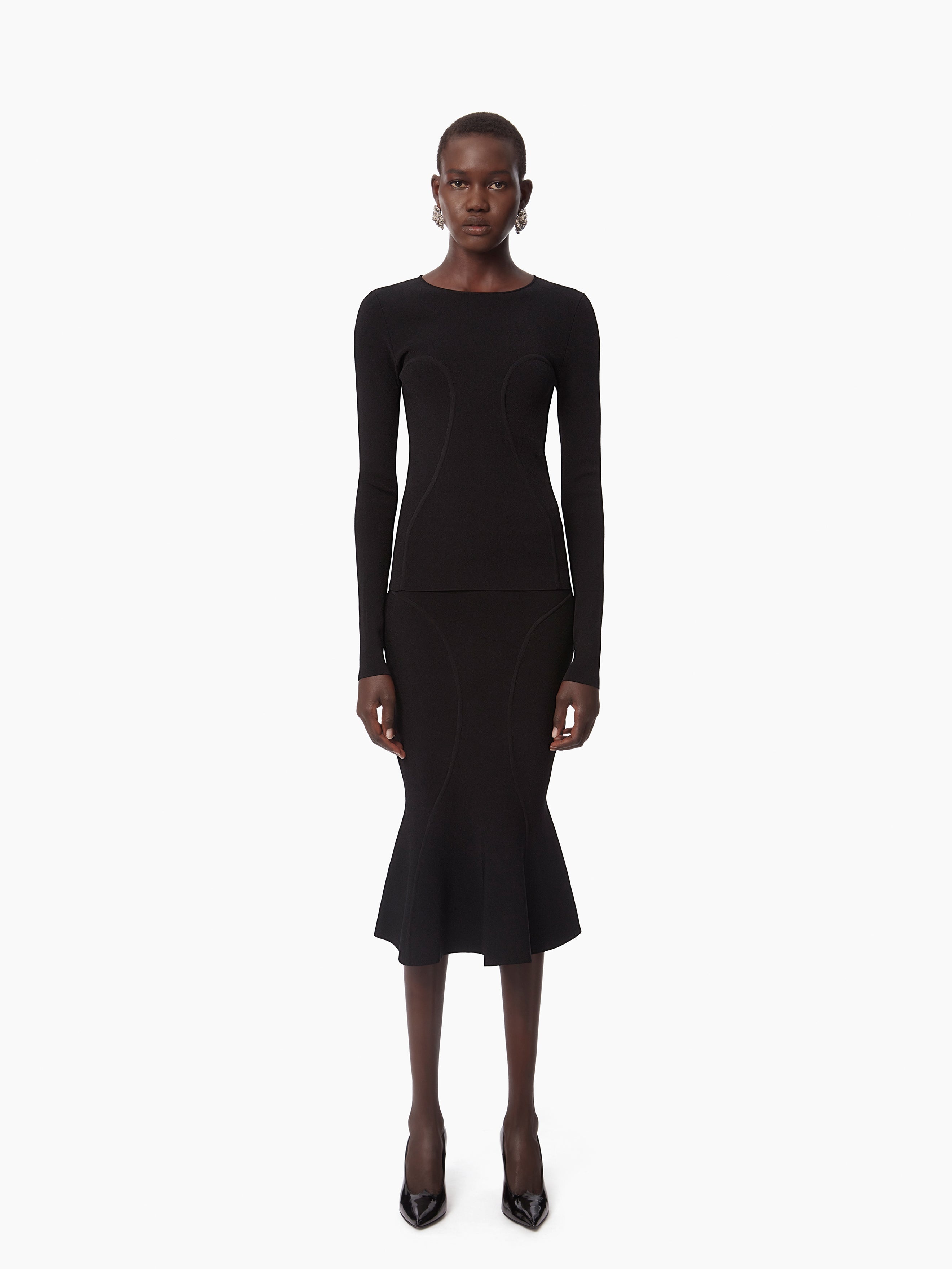 This top is crafted in a close-fitting knit and features seamed cutlines that enhance the silhouette. It will be equally at home with a knitted skirt for a total Nina Ricci look or with jeans for a more casual look. Fitted . If you have a large bust, take 1 size up. COMPOSITION & DETAILS - 83% viscose, 17% Elite. - Fitted cut. - Round collar. - Cut-out seams. - Long sleeves. - Model is 180 cm and wears a size S (FR). - Ref : 24AMPU014ML0558U9000