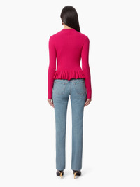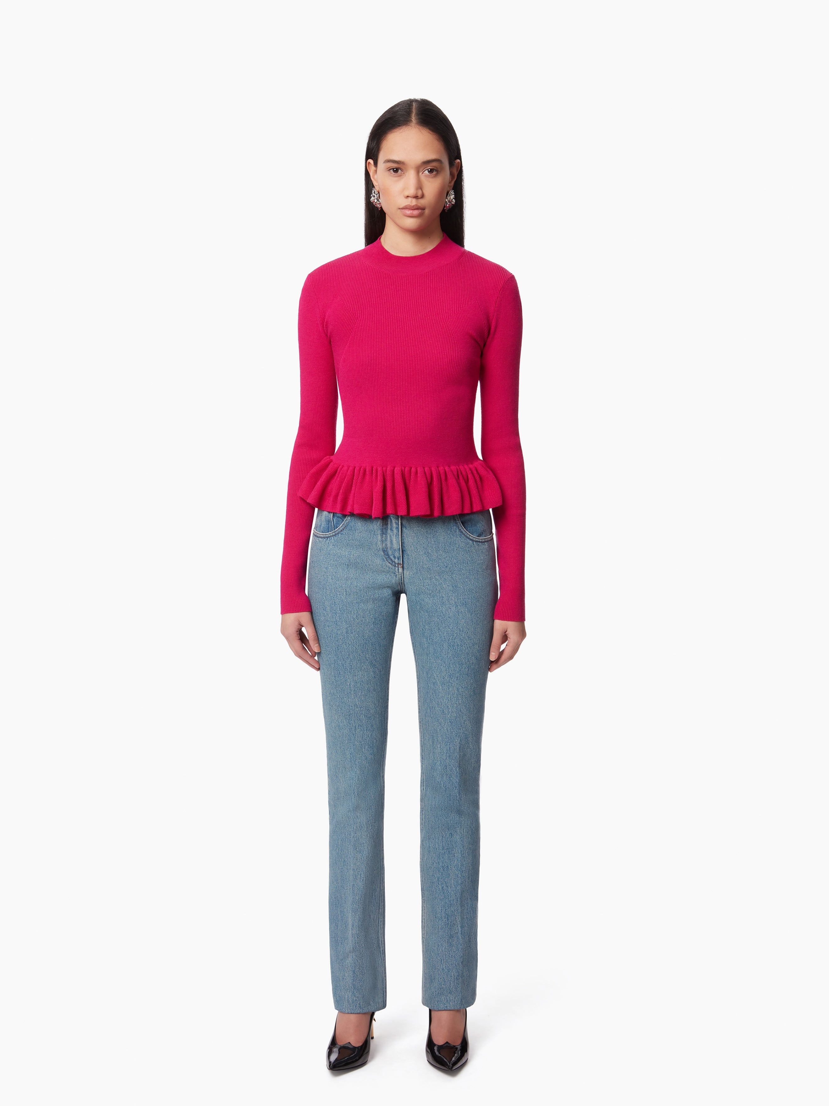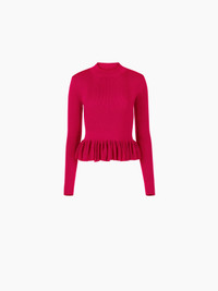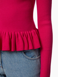 This delicately crafted top in fine ribbed knit is characterized by its ruffles and sublimates the feminine silhouette. It will be equally at home with the matching skirt for a total Nina Ricci look or with jeans for a more casual outfit. This style fits true to size. Take your regular size. COMPOSITION & DETAILS - 87% wool, 11% polyamide, 2% elastane. - Fitted cut. - Round neck. - Ruffled bottom. - Model is 178 cm and wears a size S (FR). - Ref : 24AMPU001ML0562U2741