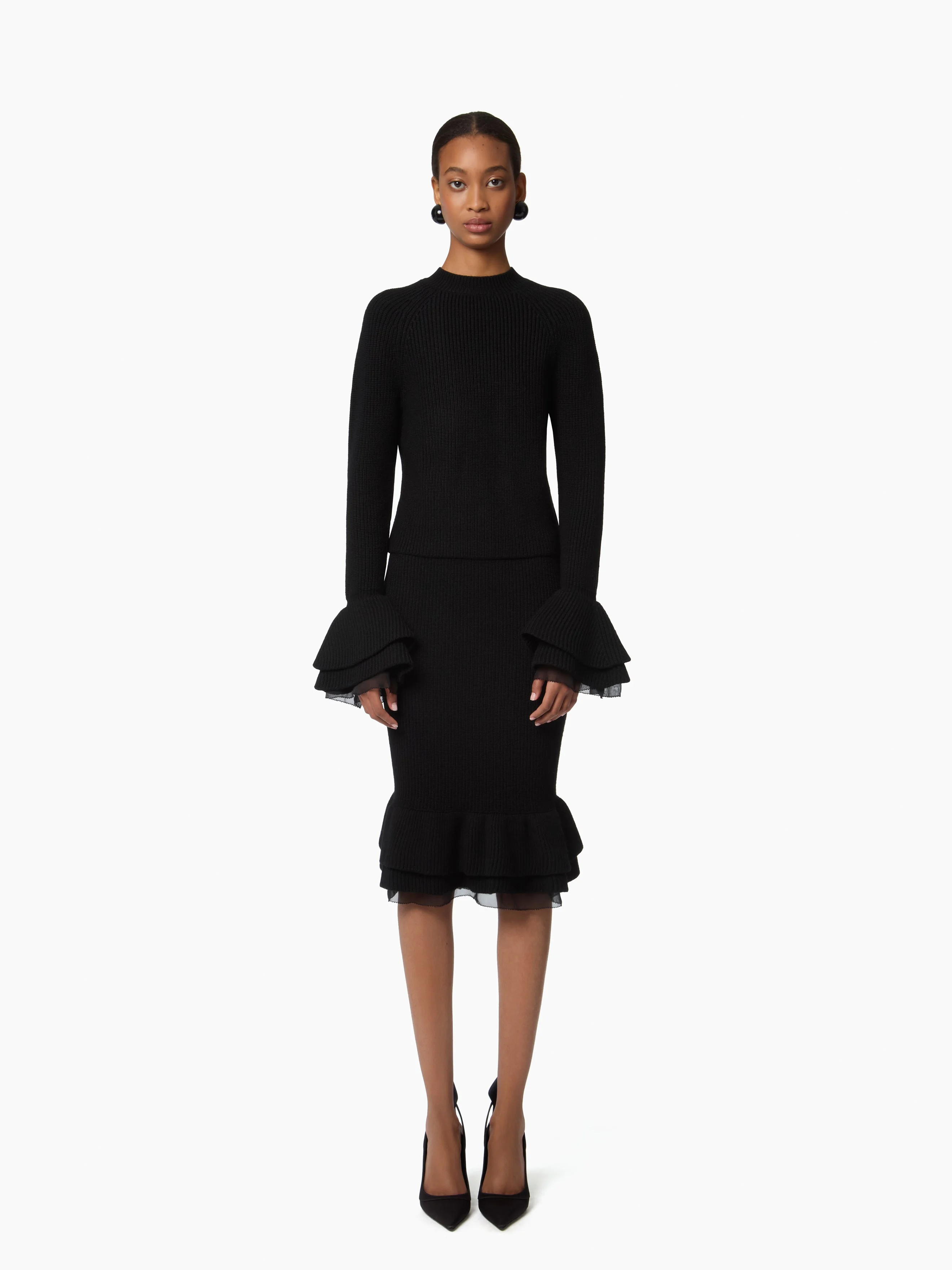 This black wool sweater stands out for its subtle play on textures. The front features a fitted silhouette with a gently raised crew neckline, creating a clean and structured look. At the cuffs, layered chiffon ruffles add a soft, airy finish. The back reveals a delicate teardrop opening tied with a ribbon, lending a feminine and graceful touch to the piece. COMPOSITION & DETAILS - 100% wool. - Fitted cut. - Slightly raised crew neckline. - Teardrop opening at the back, fastened with a ribbon. - Ruffled cuffs. - Raglan sleeves. - Model is 180 cm/ 5ft 11in and wears a size S. - Ref: 25AMPU012ML0581U9000.
