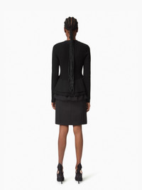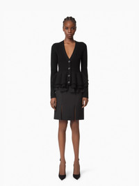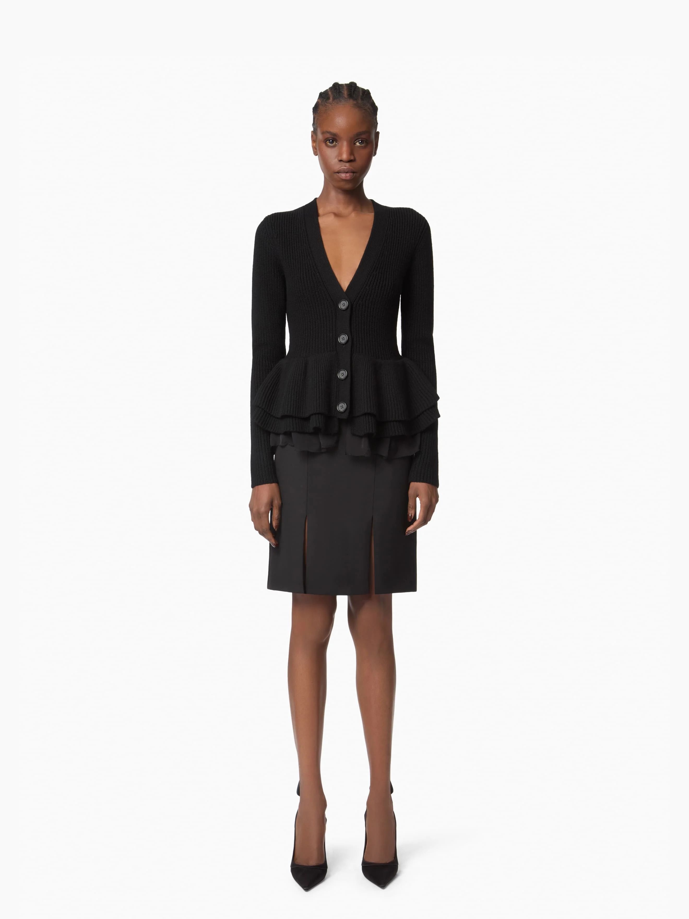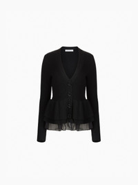 This black V-neck cardigan with long sleeves stands out for its elegant construction and refined finish. Featuring a ruffled peplum made of layered knit and a tone-on-tone pleated flounce, it brings movement and lightness to the silhouette. Closed with black buttons at the front, it blends comfort and femininity with a couture-inspired attitude. COMPOSITION & DETAILS - 100% wool. - Fitted cut. - V-neckline. - Bi-fabric ruffled peplum. - Front button closure with 4 buttons. - Model is 178 cm/5ft 10in and wears a size S. - Ref: 25AMCR008ML0581U9000