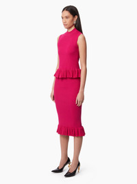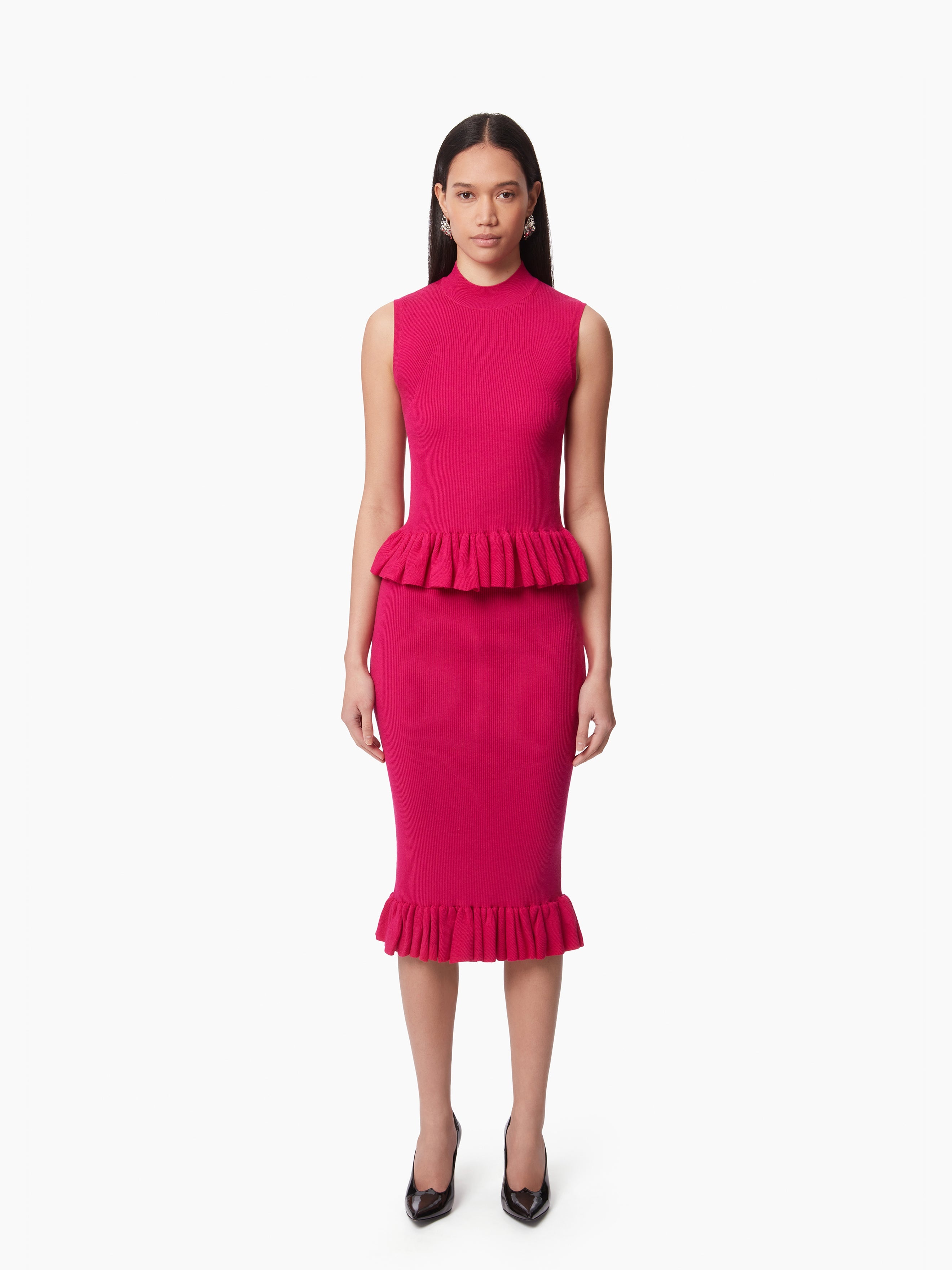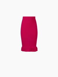 This fitted midi skirt is exquisitely crafted from a fine ribbed knit, offering a close-to-the-body silhouette. Enhanced with ruffles, it adds a touch of femininity and elegance. Pair it perfectly with the matching top for a complete Nina Ricci ensemble. Fitted. Take your regular size. COMPOSITION & DETAILS - 87% wool, 11% polyamide, 2% elastane. - Fitted cut. - Midi length. - High elastic waistband. - Model is 178 cm and wears a size S (FR). - Ref : 24AMJU008ML0562U2741