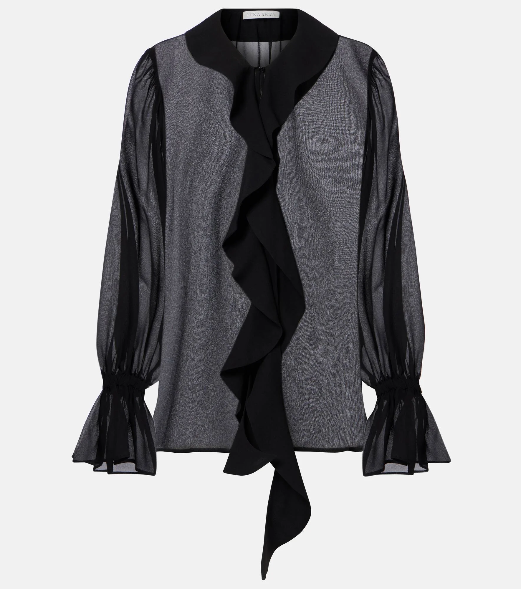 A skillful play of structure and proportion ensures the house of Nina Ricci remains a tastemaker for Parisian style. Crafted from silk, this sheer blouse showcases a ruffled trim on the front and gathered cuffs on both sleeves. Product Details - Material: 100% silk - Care instructions: dry clean - Made in Poland - Color: black - Designer color name: Noir - Cuff: elasticated - Item number: P01141669 Size & Fit - True to size - Sheer - Designed for a loose fit - Non-stretchy fabric - Falls below the hip - The model seen in the picture is 178cm-5'10" and wearing a size FR 36