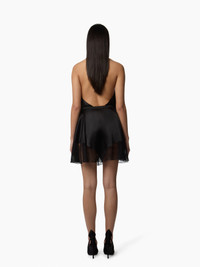 This black stretch satin mini skirt stands out with its pointed hem design and refined play on transparency. The hem is trimmed with delicately pleated polka-dot tulle, bringing lightness and fluidity to the silhouette. Blending sensuality and couture flair, this Fall-Winter 2025 piece captures the bold elegance of the Nina Ricci aesthetic. COMPOSITION & DETAILS - 52% viscose, 37% silk, 11% elastane. - Flared silhouette. - Integrated shorty under the skirt. - Model is 178 cm/ 5ft 10in and wears a size 36 (FR). - Ref: 25ACJU012VI0530U9000