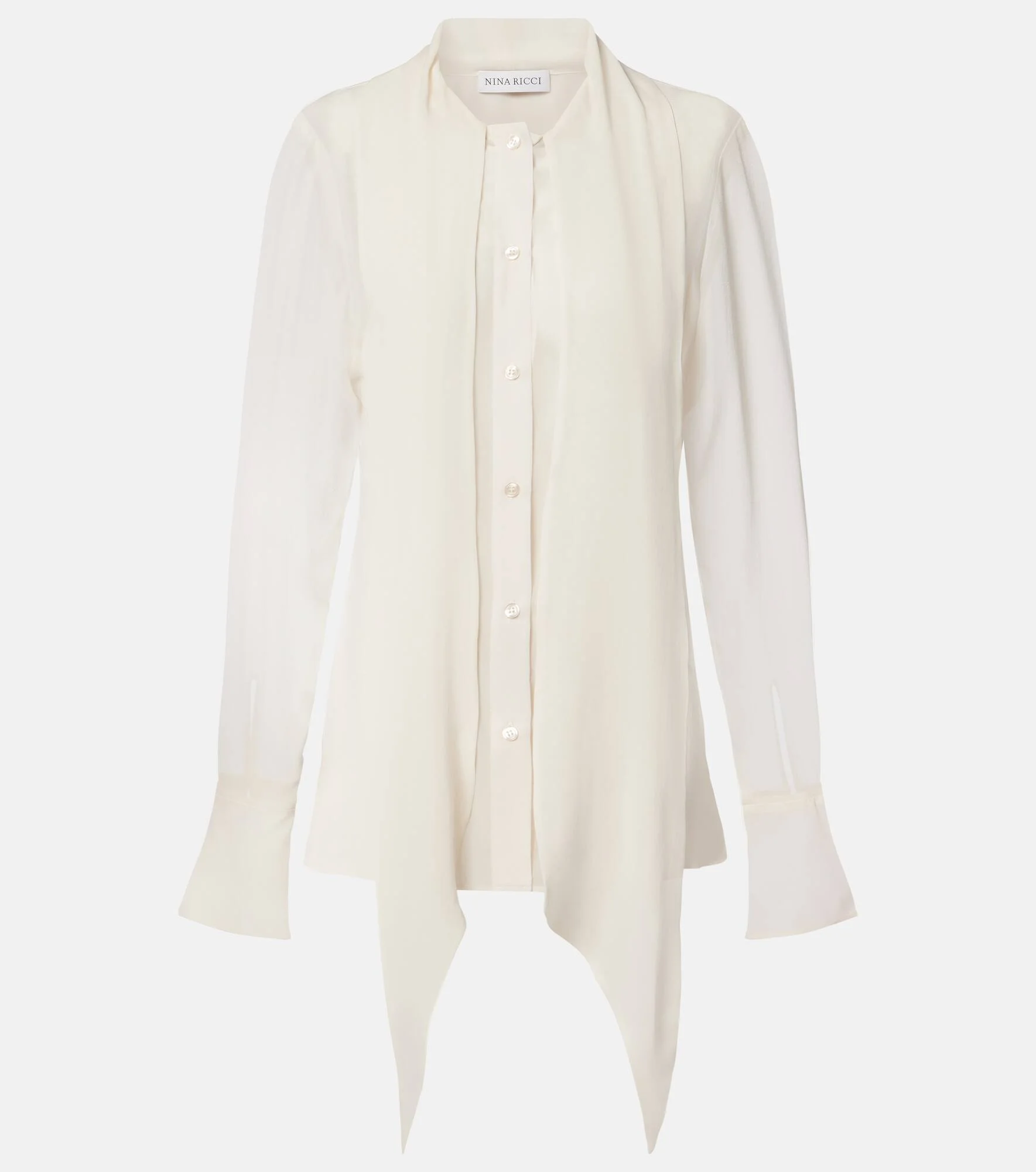 A skillful play of structure and proportion ensures the house of Nina Ricci remains a tastemaker for Parisian style. This blouse is made from pure silk in a shirting-inspired silhouette with flared cuffs. Product Details - Material: 100% silk - Care instructions: dry clean - Made in Poland - Color: white - Designer color name: Creme - Self-tie collar - Closure: buttoned front - Cuff: one button - Hem: rounded - Item number: P01141668 Size & Fit - True to size - Semi-sheer - Straight fit - Non-stretchy fabric - Falls below the hip - The model seen in the picture is 178cm-5'10" and wearing a size FR 36