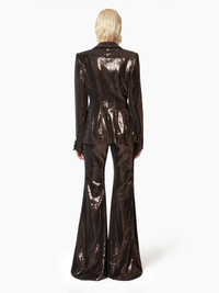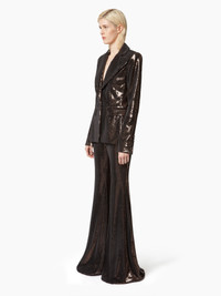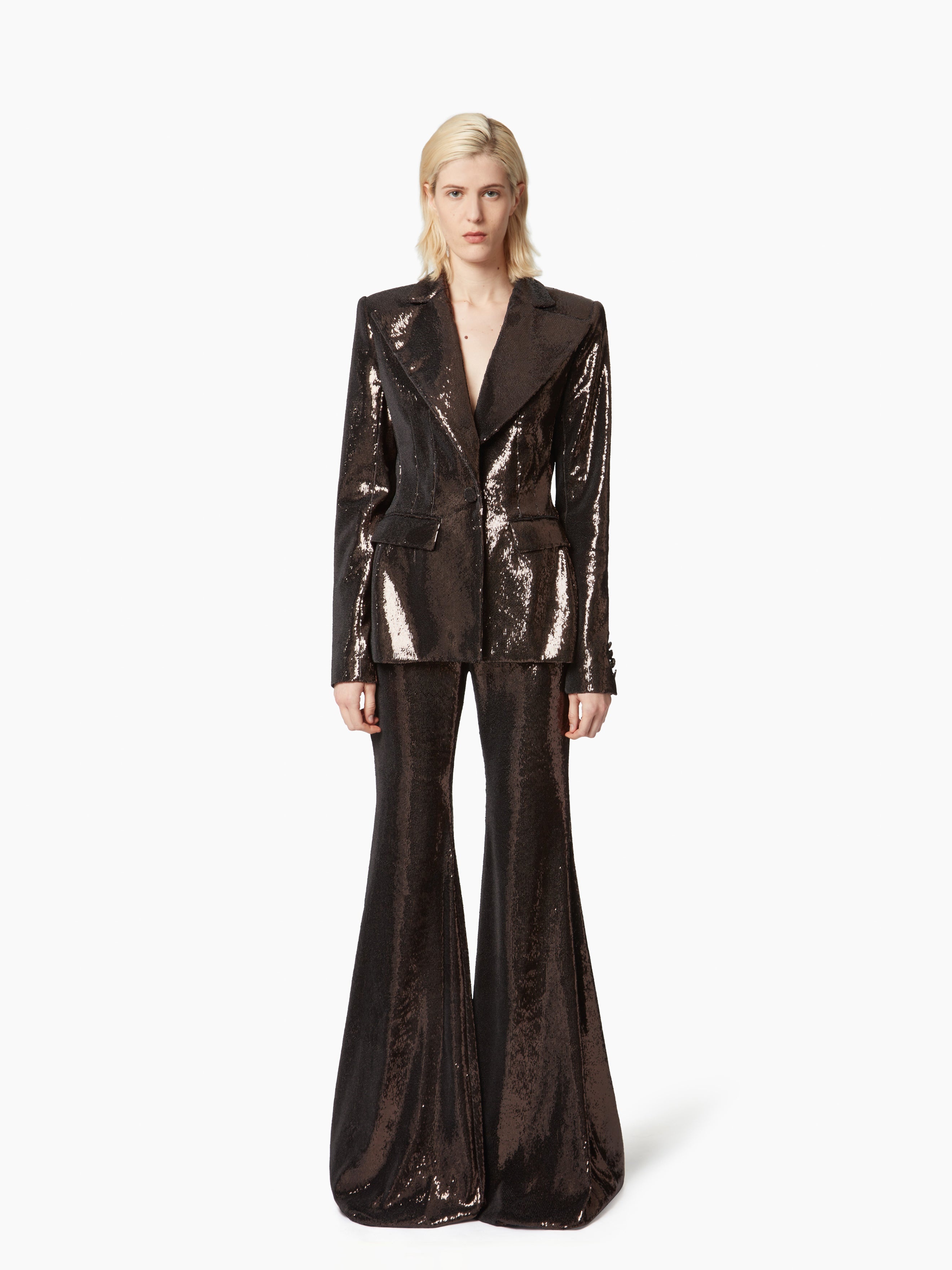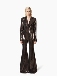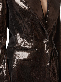 Emblematic of the Nina Ricci silhouette, the suit symbolizes timeless elegance. Harris Reed adapts and reinterprets it each season in a variety of styles. Crafted in chocolate-colored sequins, this blazer has a slim fit and a single-button closure. Paired with tailored pants or the collection's matching flared pants, it will stand out for a total Nina Ricci look. COMPOSITION & DETAILS - 100% polyester. - Matching single-button closure. - Flap pockets on hips. - Model is 181 cm and wears a size 36 (FR). - Ref : 25PCVE011PL0472U7334