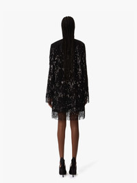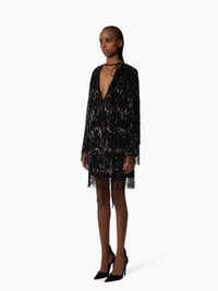 This black mini dress embodies the festive elegance of the Fall-Winter 2025 collection. Fully embellished with sequin fringes, it catches the light with every move for a dazzling silhouette. The plunging V-neckline is adorned with a tie detail, while the sheer long sleeves add a delicate contrast to this bold evening piece—designed to elevate the most refined occasions. COMPOSITION & DETAILS - 100% polyester. - Straight fit. - Mini length. - Plunging V-neckline with bow detail. - Model is 178 cm/ 5ft 10in and wears a size 36 (FR). - Ref: 25ACRO041PL0481U9000