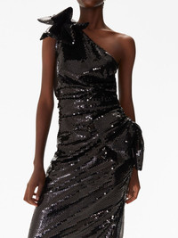 sequin-embellished one-shoulder dress Highlights - Black - Sequin embellishment - Bow detailing - One-shoulder - Straight hem - Long length Imported Composition Polyester 84%, Polyamide 16% SIZE & FIT Measurement HIPS 32.28 in(82 cm) LENGTH 63.38 in(161 cm) WAIST 24.4 in(62 cm)