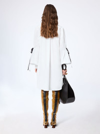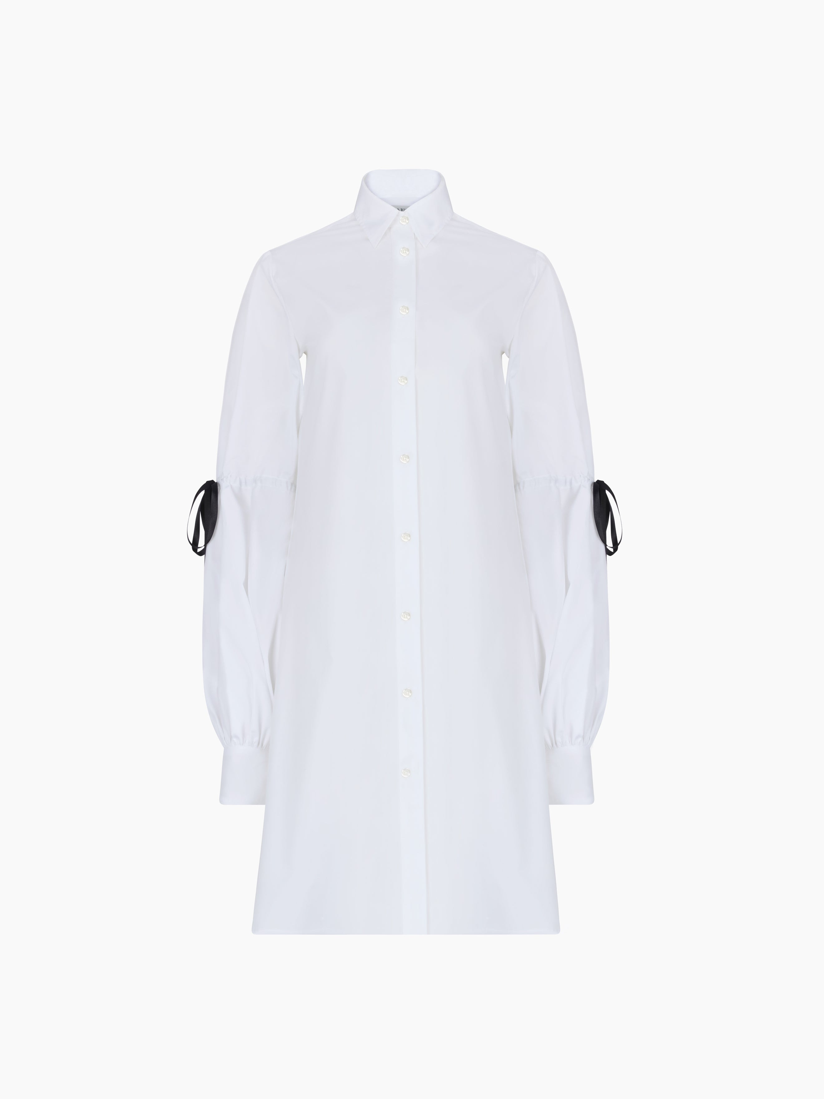 From the Spring-Summer 2026 collection, this crisp white shirt dress reinterprets a classic silhouette through the lens of playful femininity. Cut in structured cotton poplin, it features voluminous sleeves cinched with signature satin bows, a subtle nod to Nina Ricci’s house codes. Styled alone or layered, it offers a fresh balance of purity and provocation imagined by Harris Reed. COMPOSITION & DETAILS - 100% cotton. - Side bow details. - Model is 179 cm/ 5ft 10in and wears size 36 (FR). - Ref: 26PCRO055CO0539U1000
