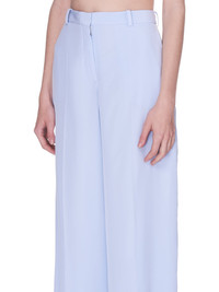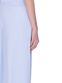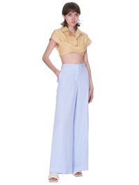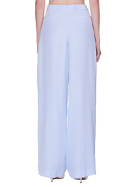 Nina Ricci trousers in blue, button and clasp closure, zip fly, belt loops, slash hand pockets, back welt pockets, front crease, wide leg silhouette, straight/finished hem, tonal stitching. Made in Italy. French Sizing. Composition - 100% Silk. Model Measurements: Model is 5ft 8” and wearing a size 36. Bust: 32” Waist: 24” Hip: 34"