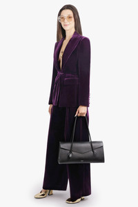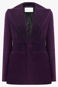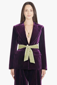 The Single-Breasted Velvet Jacket is tailored from plush cotton velvet, offering a structured yet tactile silhouette. It features a clean front with a single button fastening and tonal dual front pockets. A removable green velvet ribbon closure offers an unexpected styling accent, adding contrast and customisation to the refined purple hue. - Fabrication: 100% cotton - Plush velvet texture in rich purple tone - Classic single-breasted cut with structured shoulders - Exaggerated collar - Dual front patch pockets - Tonal front button fastening - Optional green velvet ribbon front tie Style with wide-leg trousers or a structured tote to emphasise the jacket’s tailored contrast and luxurious finish. Size and Fit Tiah: Model is 178cm/5’9” and is wearing a size FR36 Model Measurements: Bust: 86cm, Waist: 69cm, Hips 90.5cm Fits true to size.