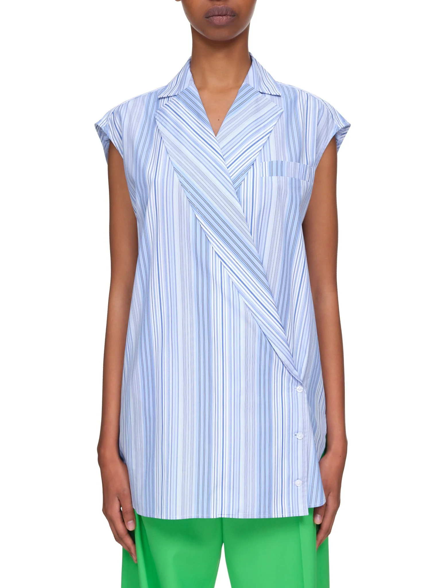 Nina Ricci blouse in blue, notched lapel collar, chest welt pocket, wrapped silhouette featuring asymmetric front button closure, all over stripes, extended silhouette. French Sizing. Composition: 88% Cotton, 12% Polyamide. Model is 5ft 8” and wearing a size 36. Bust: 32” Waist: 24” Hip: 35"