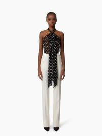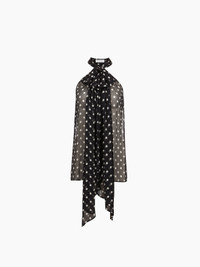 This halterneck shirt in black crinkled silk chiffon with cream polka dots floats with airy elegance and stands out for its bold silhouette. A long lavalliere scarf adds movement and freedom—wear it knotted or draped loose. The open back reveals the silhouette with subtle allure, making it perfect for a refined evening look with understated charm. COMPOSITION & DETAILS - 100% silk. - Regular fit. - Attached lavalliere. - Open back. - Closes at the back with two concealed buttons. - Model is 178 cm/ 5ft 10in and wears a size 34 (FR). - Ref: 25ACTO034SE1409I9072