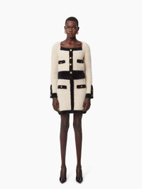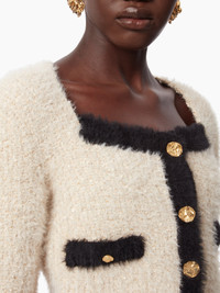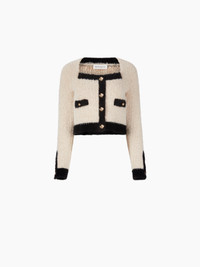 Exclusive to the Fall-Winter 2024 collection, gold knitted tweed is finely crafted to create this elevated cardigan. Highlighted by a black trim and embellished with textured gold-tone buttons, it can be worn elegantly with the matching skirt for a total Nina Ricci look or with jeans for a more casual outfit. Fitted. Take your regular size. COMPOSITION & DETAILS - 46% polyamide, 34% cotton, 16% viscose, 3% metallic fibers, 1% elastane. - Fitted cut. - Square collar. - Contrast trim. - Textured buttons. - Long sleeves. - Model is 180 cm and wears a size S (FR). - Ref : 24AMCR001ML0557U1776