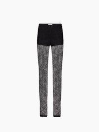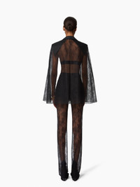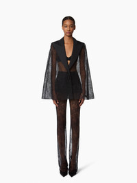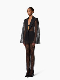 Crafted from black lace, these pants reinterpret eveningwear with sensuality and lightness. Their ultra-slim fit hugs the body’s curves, creating a sleek and confident silhouette. Perfect for elevating an evening look, they bring a bold and refined touch to the Fall-Winter 2025 collection. Worn with the matching jacket, they form one of the season’s standout ensembles. COMPOSITION & DETAILS - 74% polyamide, 26% viscose. - Body-hugging fit. - No waistband. - Opaque upper panel for comfort and coverage. - Concealed closure. - 2 slanted pockets. - Model is 180 cm/ 5ft 11in and wears a size 36 (FR). - Ref: 25ACPA008PA0492U9000
