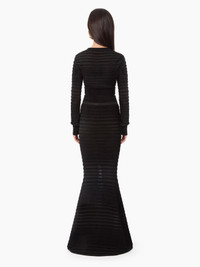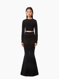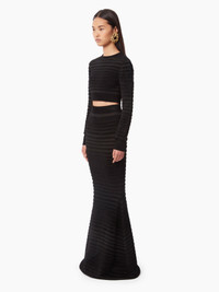 The Maison's signature silhouette, the mermaid skirt, symbolizes Nina Ricci's femininity. For Fall-Winter 2024, Harris Reed reinterprets it in a textured knit with transparent and opaque stripes. Fitted. If you are between 2 sizes, take 1 size up. COMPOSITION & DETAILS - 80% viscose, 20% polyamide. - Mermaid cut. - Maxi length. - Play on textures and materials in a stripe pattern. - Model is 181 cm and wears a size S (FR). - Ref : 24AMJU022ML0554U9000