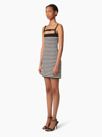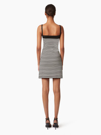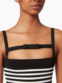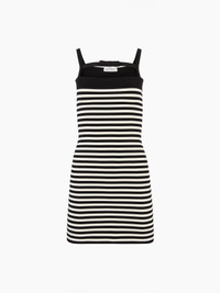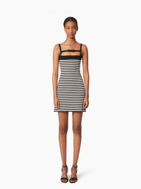 Crafted in black mesh, this dress features ecru stripes and a bow at the neckline, two emblematic symbols of the Maison Nina Ricci. COMPOSITION & DETAILS - 100% viscose. - Slim fit. - Contrasting stripes. - Square neckline with bow detail. - Model is 180 cm tall and wears a size S. - Ref : 25PMRO056ML0574U1335