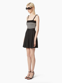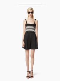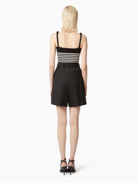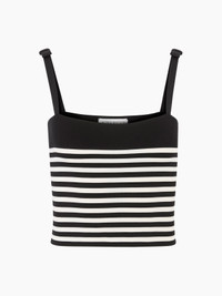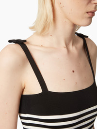 Crafted in black knit, this tank top features ecru stripes and bows on the straps, two emblematic symbols of the Maison Nina Ricci. COMPOSITION & DETAILS - 100% viscose. - Slim fit. - Square neckline. - Contrasting stripes. - Knots on straps. - Model is 181 cm tall and wears size S. - Ref : 25PMPU001ML0574U1335”