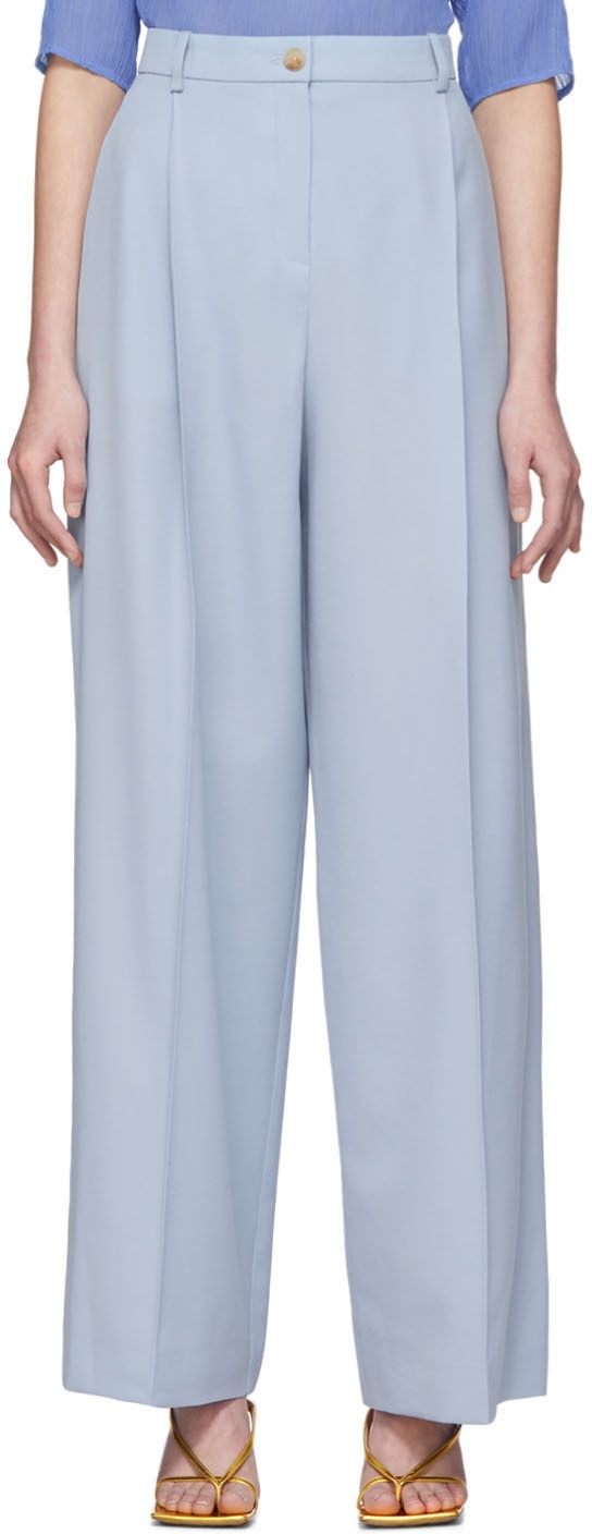 Wide-leg wool trousers in blue. High-rise. Three-pocket styling. Belt loops at waistband. Pleats at front. Central creases at front and back. Zip-fly. Supplier color: Blue