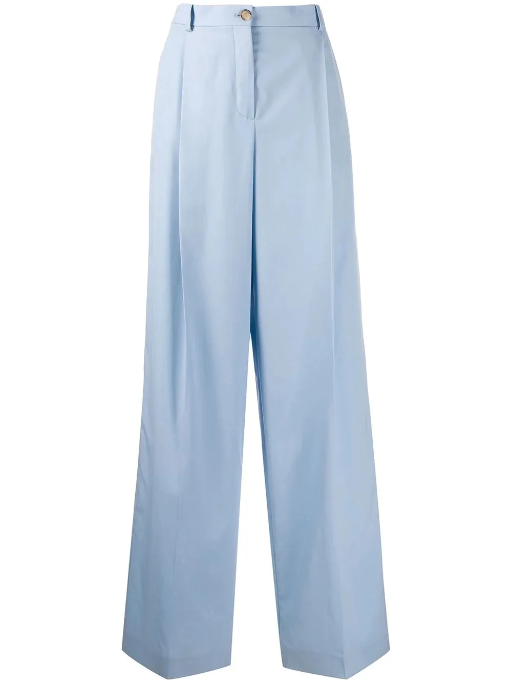 super flared trousers Light blue virgin wool super flared trousers from Nina Ricci featuring a waistband with belt loops, a front button fastening, side pockets, a back pocket and a long length. Imported Composition Virgin Wool 100% SIZE & FIT Model measurements Height 5 ft 9 in(1.76 m) Bust/Chest 33.07 in(84 cm) Hips 34.64 in(88 cm) Waist 25.59 in(65 cm) FittingInformation This piece fits true to size. We recommend you get your regular size Cut for a loose fit Made with a mid-weight non-stretch fabric Washing instructions Dry Clean Only