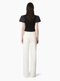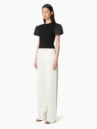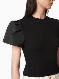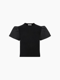 This short-sleeved flared tee is crafted in mesh and faille. It offers a modern look, and a play of materials accents the build. COMPOSITION & DETAILS - 82% cotton, 18% polyamide. - Slim fit. - Round collar. - Puff sleeves. - Model is 182 cm and wears a size S. - Ref : 25PMPU009ML0571U9000