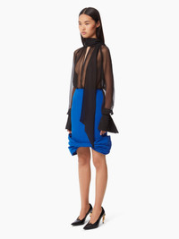 For the Fall-Winter 2024 collection, the midi skirt is reinterpreted by Harris Reed. Crafted in taffeta faille, pleating reveals a bow cleverly integrated into the skirt hem, revisiting the Maison's codes. If you are between 2 sizes, take 1 size up. COMPOSITION & DETAILS - 100% recycled polyester. - Fitted cut. - Midi length. - High waist. - Bow peplum. - Zipper closure. - Model is 181 cm and wears a size 36 (FR). - Ref : 24ACJU014PL0440U4633