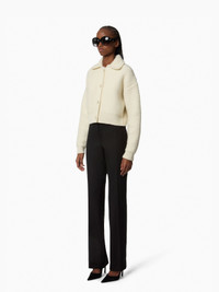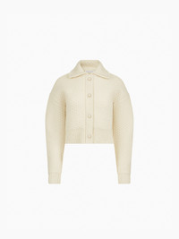 This cream-colored cardigan is crafted in a square-knit wool blend, giving the piece a refined texture and subtle depth. Its tailored collar, tonal button fastening, and ribbed trims at the cuffs and hem lend a polished touch. Soft and warm, it brings a relaxed yet elegant feel to any silhouette. COMPOSITION & DETAILS - 73% wool, 27% polyamide. - Straight cut. - Shirt collar. - Fastens with 4 tonal buttons. - Raglan sleeves. - Ribbed cuffs and hem. - Model is 178 cm/ 5ft 10in and wears a size S. - Ref: 25AMCR010ML0583U1230