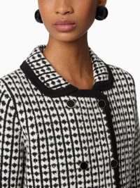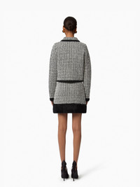 This black and white double-breasted cardigan is crafted in tweed-effect knit, adding a graphic, structured touch to the silhouette. It features black contrast trims at the collar, cuffs, and pockets, along with black buttons set in gold. Worn with the matching skirt, it completes a bold Nina Ricci total look. For a more casual vibe, pair it effortlessly with denim. COMPOSITION & DETAILS - 86% wool, 7% mohair, 6% polyamide, 1% elastane. - Fitted cut. - Rounded tailored collar. - Button closure.- Contrasting trims at collar, cuffs, and pockets. - 2 welt pockets. - Model is 180 cm/ 5ft 11in and wears a size S. - Ref: 25AMCR007ML0585U9000