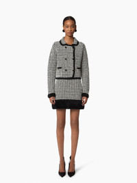 This black and white tweed-effect knit mini skirt stands out with its bold, graphic look and cozy texture. A wide black boucle knit cuff adds contrast and volume to the silhouette. Perfect with the matching double-breasted cardigan for a full Nina Ricci ensemble, it also pairs effortlessly with a crisp shirt or a plain sweater for a more casual attitude. COMPOSITION & DETAILS - 42% wool, 31% polyamide, 27% lyocell. - Fitted cut. - Mini length. - Boucle-effect wide trim at the hem. - Model is 180 cm / 5ft 11in and wears a size S. - Ref: 25AMJU002ML0579M1119