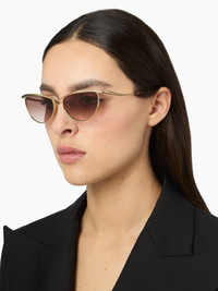 This vintage-inspired shape of sunglasses stand out with their distinctive concave top bar, creating a bold yet refined silhouette. The elegantly curved temples seamlessly connect to the metal top bar, forming a smooth, flowing profile. A subtle touch of sophistication, the Nina Ricci lettering logo adorns the left temple, signing this timeless design.