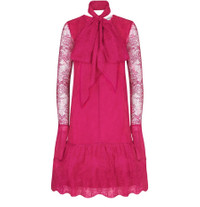 DESCRIPTION - knee length - lace details - ruffle details - lavaliere/tie-neck - long-sleeved - high-neck - logo at the back label DETAILS AND CARE MATERIAL: Main material : 73% Polyamide / 27% Viscose COLOR: fuchsia COUNTRY OF MANUFACTURE: Bulgaria PRODUCT CODE: RIC3394KPIN5EA1A00