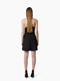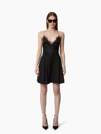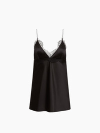 This black satin cami top embodies timeless elegance. Featuring a delicate V-neckline trimmed with lace, fine straps, and a fluid cut, it brings a refined, sensual touch to any look. Designed for the Fall-Winter 2025 collection, this versatile piece can be layered under a tailored blazer by day or worn on its own for a subtly glamorous evening silhouette. COMPOSITION & DETAILS - 52% viscose, 37% silk, 11% elastane. - Regular fit. - Thin straps. - V-neckline. - Lace trim along the neckline. - Model is 178 cm/ 5ft 10in and wears a size 36 (FR). - Ref: 25ACTO036VI0530U9000