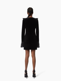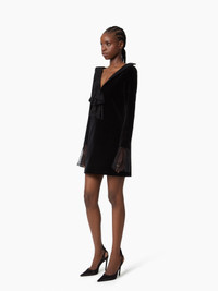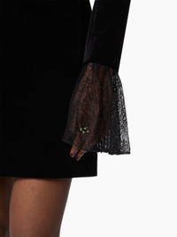 This black velvet mini dress captivates with its couture allure and delicate detailing. The plunging neckline is elevated by a wide V-shaped lace-trimmed collar, finished with a refined tulle bow. Long sleeves flare out into transparent lace bell cuffs, adding a sensual, structured finish. A bold, feminine piece that reflects the timeless elegance of the Maison Nina Ricci. COMPOSITION & DETAILS - 100% cotton. - Straight fit. - Mini length. - Invisible zip fastening at the back. - Bell cuffs. - Model is 180 cm/ 5ft 11in and wears a size 36 (FR). - Ref: 25ACRO034CO1100U9000