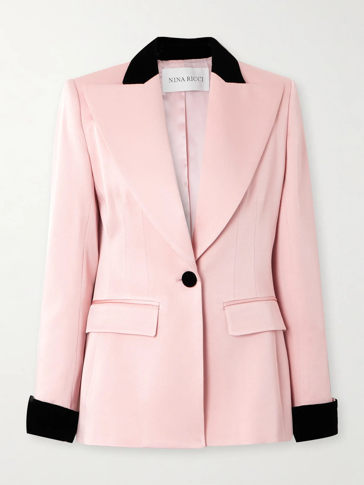 Nina Ricci always strikes the perfect balance between elegance and playfulness. Inspired by tuxedo jackets, this blazer is tailored from pink satin and traced with black velvet along the collar and French cuffs. The wide peak lapels frame your face so nicely.