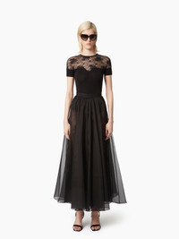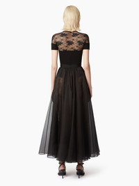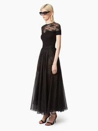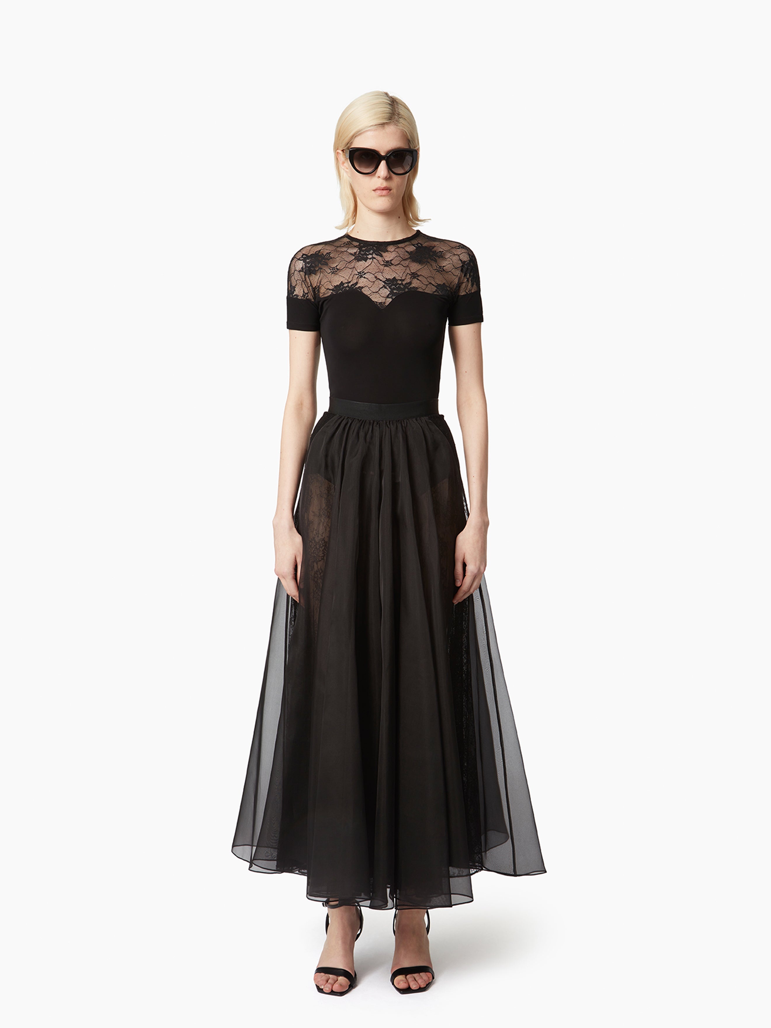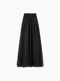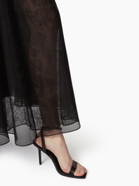 This long, voluminous skirt in silk organza, adorned with lace details, brings fluidity, subtle transparency, and elegance to the silhouette. COMPOSITION & DETAILS - 100% silk. - High waist. - Maxi length. - Sheer lace details. - Model is 181 cm and wears a size 36 (FR). - Ref : 25PCJU020SE0789U9000