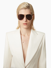 Bold and daring, these cat-eye acetate sunglasses presented in the SS25 fashion show, feature a faceted front and sleek, geometric temples. The iconic gros-grain pattern is elegantly engraved on the wire-core, visible in translucent options and lining the inside of solid-colored temples.