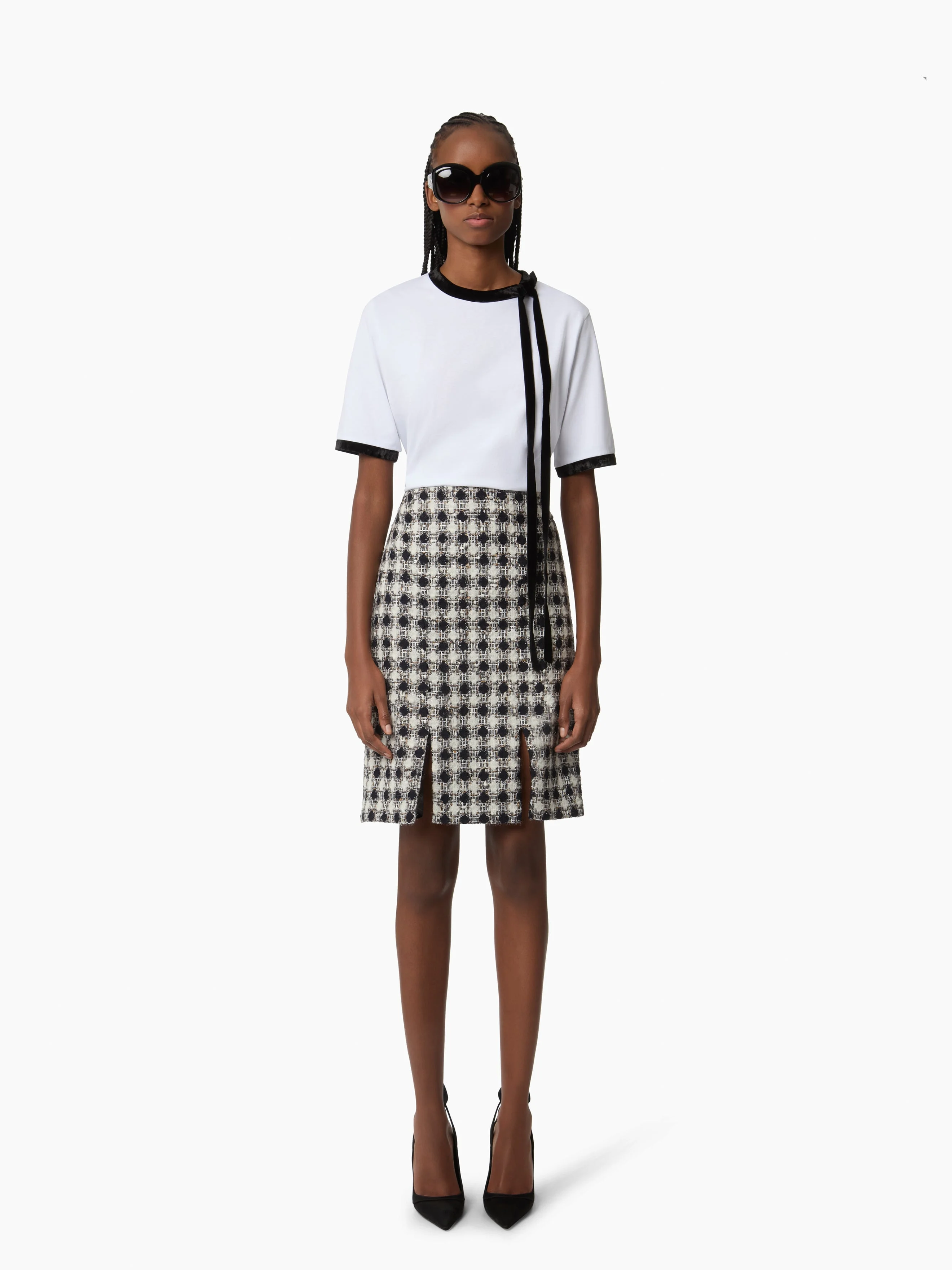 This white short-sleeved t-shirt is made from stretch cotton jersey for optimal comfort. It features a black velvet ribbon delicately applied along the neckline—a signature Nina Ricci detail—alongside contrasting finishes at the sleeves for a refined twist. COMPOSITION & DETAILS - 100% cotton. - Straight cut. - Crew neckline. - Velvet ribbon detail at the collar. - Contrasting finishes at sleeves and collar. - Model is 178 cm/ 5ft 10in and wears a size S. - Ref: 25AJTO035CO1108U1000