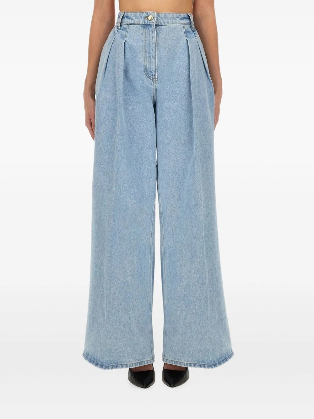pleated denim trousers Highlights - Blue - Front pleats - Side inset pockets - Rear patch pockets - Wide leg - Button and zip closure Imported Composition Cotton 100% Washing instructions Read Manufacturer Guidelines