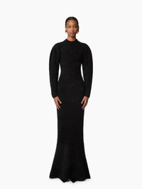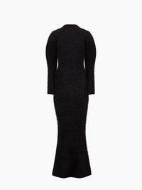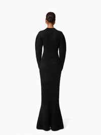 This long black dress with long sleeves is crafted from brushed stretch knit, perfect for winter. Featuring a round neckline and a tapered silhouette, it hugs the body and elongates the line for a refined, minimalist look. COMPOSITION & DETAILS - 51% alpaca, 36% wool, 12% polyamide, 1% elastane. - Fitted cut. - Maxi length. - Round neckline. - Model is 180 cm/ 5ft 11in and wears a size S. - Ref: 25AMRO001ML0582U9000.
