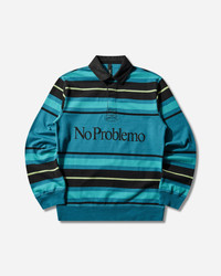 No Problemo Striped Longsleeve Rugby Shirt Aqua No Problemo offers a premium and unisex uniform of workwear, graphic styles and contemporary streetwear staples. Brought to you by Aries, the brand creates trusted fits across genderless silhouettes with attention to detail, quality of production and finish, all made possible through an established and transparent supply chain. - 100% Cotton - Regular Fit - Striped Pattern - Three-Button Placket - Graphic Printed at Front - Ribbed Cuffs and Hem - Style Code: NP4021405 AQUA