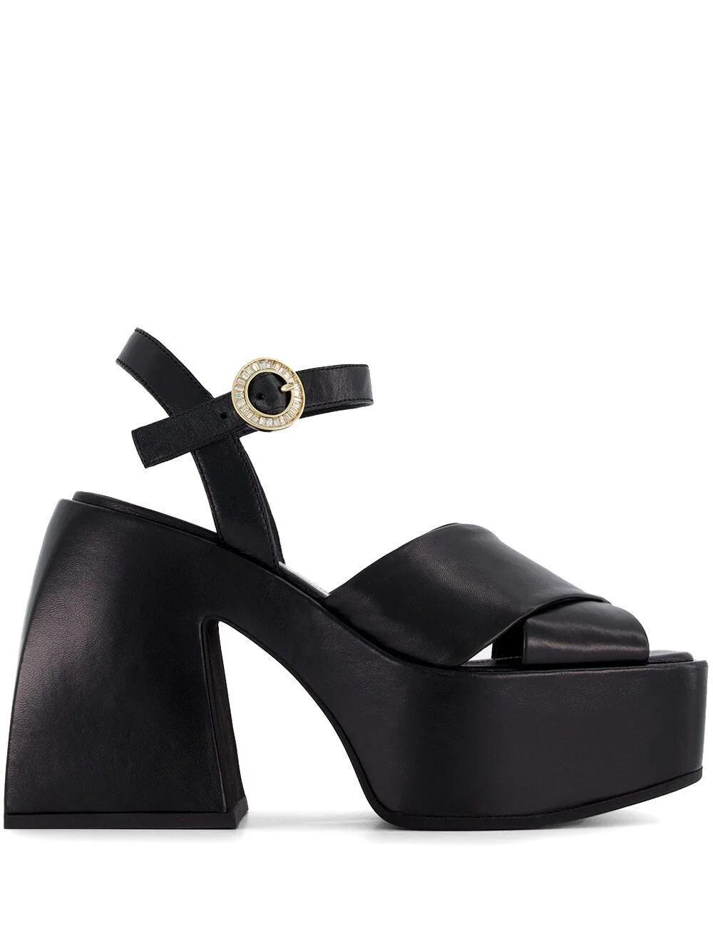 Bulla Joni platform sandals Rendered in sleek black, these Bulla Joni sandals from Nodatelo sit atop a chunky platform. Offering a slight curve to the insole is an even higher block heel, which gives a delicate finish to the leather pair. Highlights - Black - Nappa leather - Crossover strap at the toe - Square open toe - Buckle-fastening ankle strap - Branded leather insole - Platform sole - High block heel Imported Composition Leather 100%