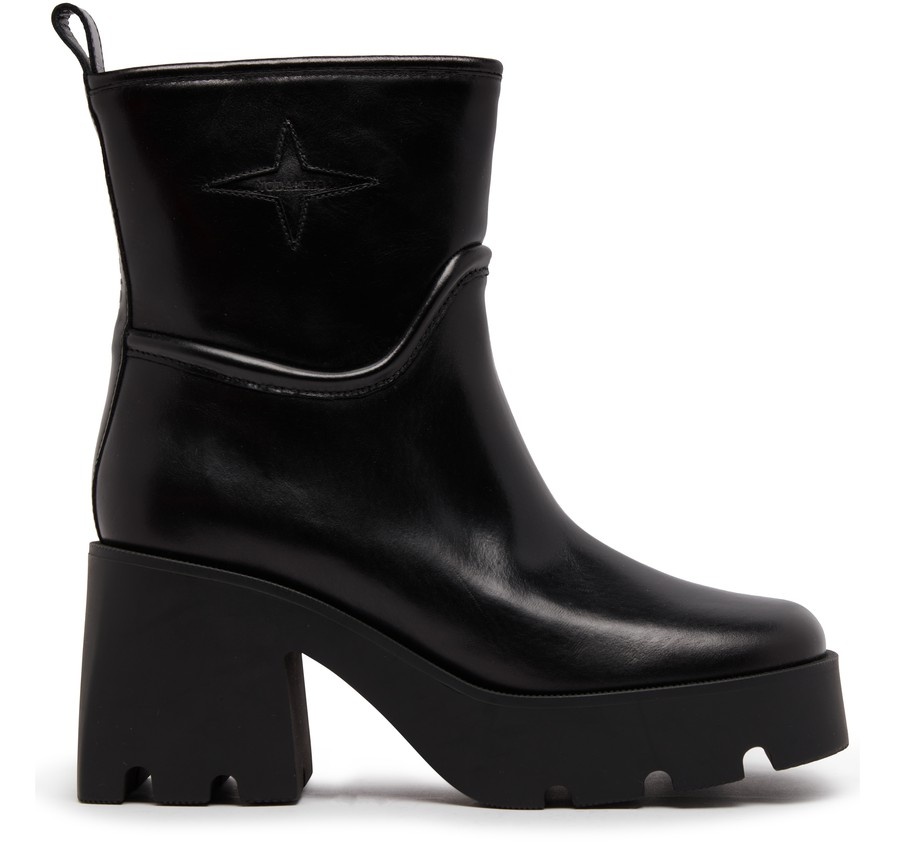 DESCRIPTION - Smooth leather - Thick, notched sole - Square heel - Logo on the side - Leather loop at the back for easy slipping on and off - Visible stitching - Pull-on design DETAILS AND CARE HEEL HEIGHT: 9 cm / 3.5 " COLOR: black_soul COUNTRY OF MANUFACTURE: Portugal PRODUCT CODE: NODR57A5BCKO2AAA00