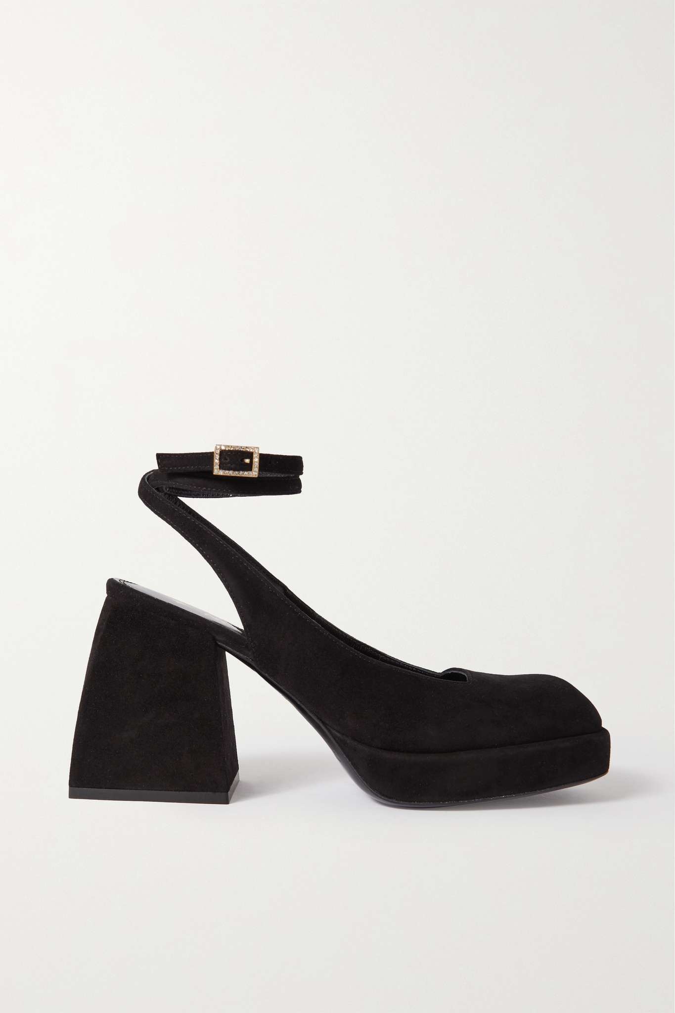 EDITORS'NOTES NODALETO describes its signature 'Bulla Babies' pumps as "an anthem to childhood and adolescence." Set on a sculptural block heel, this 'Suki' pair has an elevated platform sole and an adjustable ankle strap with a shimmering crystal-embellished buckle. SIZE & FIT - Fits true to size, take your normal size - Only available in full sizes, go up to the nearest whole size if you take a half size - Italian sizing DETAILS & CARE - Heel measures approximately 85mm/ 3.5 inches with a 20mm/ 1 inch platform - Black suede (Cow) - Buckle-fastening ankle strap - Designer color: Black Raven