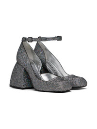 Glittered calfskin suede heels in silver-tone. · Square toe · Pin-buckle ankle strap · Logo printed at padded goatskin footbed · Grained leather lining · Covered block heel with rubber injection · Leather sole · Heel: H3.25 in Supplier color: Glitterball Upper: calfskin, goatskin. Sole: leather, rubber. Made in Italy 232430F122014