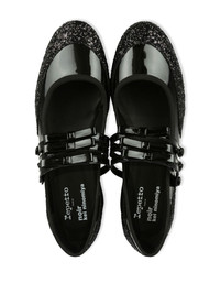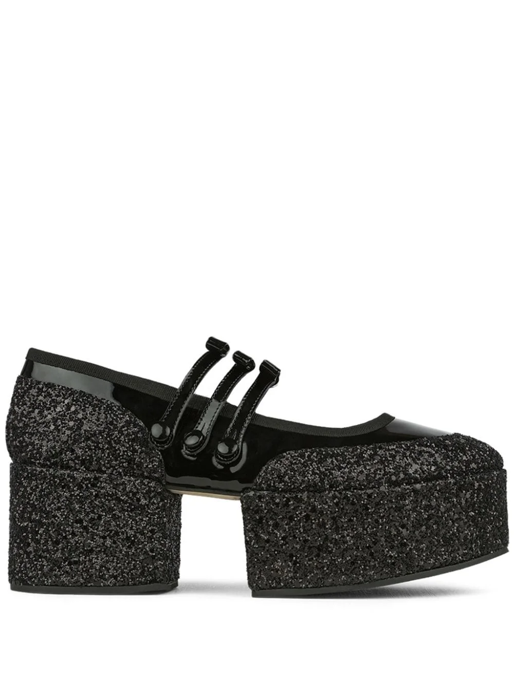 70mm glitter-embellished platform Mary Janes Rendered in black and peppered with glitter, these loafers from Noir Kei Ninomiya echo the brand's penchant for punk-inspired styles. They're finished with three bows. Highlights - Black - Leather - Patent finish - Glitter detailing - Bow detailing - Front straps - Almond toe - Block heel - Rubber sole Imported Composition Outer: CALFSKIN 50%, Polyethylene 19%, Polyurethane 16%, Polyester 13%, Viscose 2% Lining: Leather 100% Sole: Rubber 100%