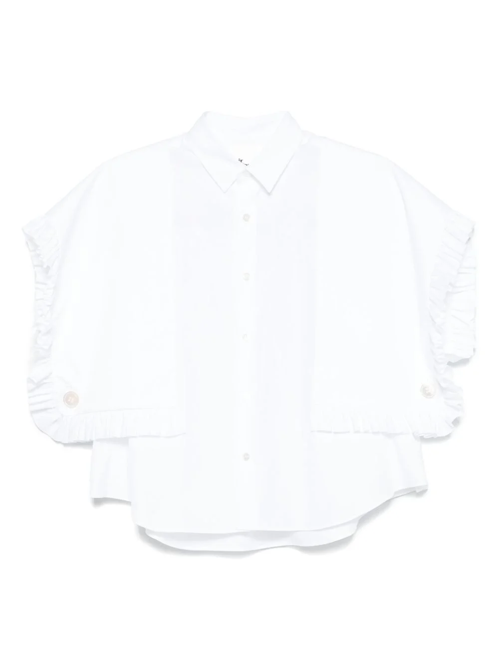 cotton shirt Highlights - White - Front button fastening - Classic collar - Short sleeves - Ruffled detailing Imported Composition Cotton 100% SIZE & FIT Model measurements Height 5 ft 10 in(1.79 m) Bust/Chest 33.07 in(84 cm) Hips 35.82 in(91 cm) Waist 24.01 in(61 cm) FittingInformation Designed to be unstructured, offering a loose fit throughout Made from a midweight non-stretch fabric Washing instructions Hand Wash