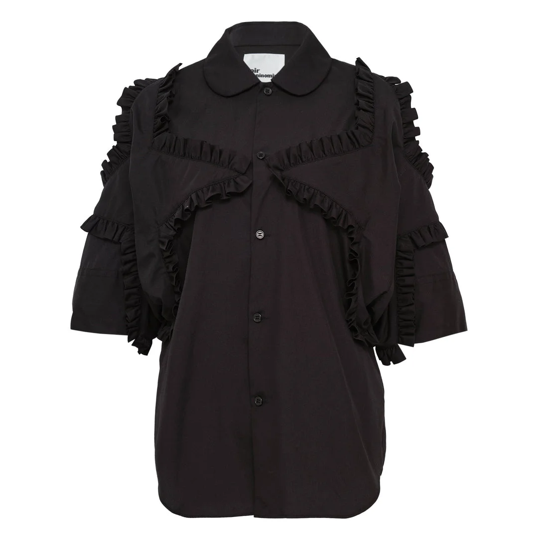 600080326BLK00L / 3Q-B006/051/1/1A - Cotton broadcloth construction - Cascading pleated ruffle detailing - Peter Pan collar - Button-front closure - Three-quarter sleeves with ruffle cuffs - Oversized relaxed fit - Black colorway Noir Kei Ninomiya Cotton Broad Blouse delivers avant-garde sophistication with architectural ruffle detailing and contemporary silhouette. Crafted from premium cotton broadcloth in classic black, featuring cascading pleated ruffles across the chest and sleeves for dramatic movement. The structured construction and signature Comme des Garcons family aesthetic create a bold statement piece for modern wardrobes.
