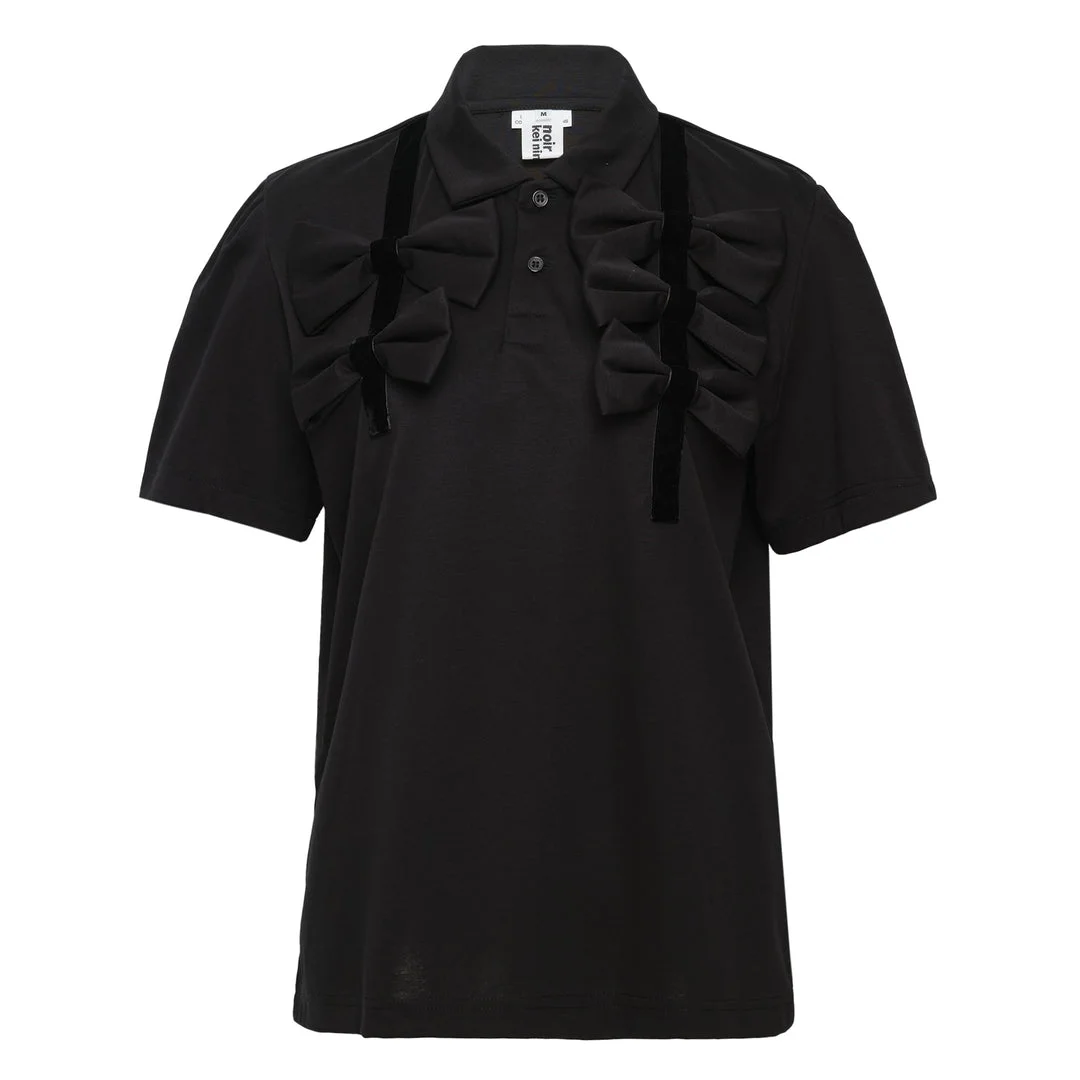 600080364BLK00L / 3Q-T007/051/1/2A - Cotton ponte fabric construction - Three-dimensional bow embellishments - Classic polo collar - Two-button placket closure - Short sleeves - Structured fit - Black colorway The Noir Kei Ninomiya Cotton Ponte Polo delivers avant-garde sophistication with architectural detailing and premium construction. Crafted from structured cotton ponte fabric in deep black, featuring dramatic bow embellishments across the chest that create sculptural dimension. The innovative design merges classic polo silhouette with Comme des Garcons' signature deconstructed aesthetic.